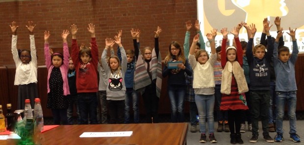 Bei der Zertifizierungsveranstaltung "Gesunde Schule" am Mittwoch, den 23. November 2016, im Kreishaus des Landratsamtes in Ludwigsburg präsentierten die Kinder der vierten Klasse zusammen mit Frau Überschuß einige Elemente des Sucht- und Gewaltpräventionsprogramms der Grundschule.