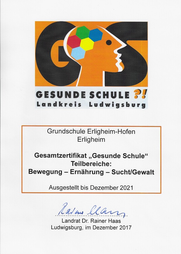 Für ihr Sucht- und Gewaltpräventionsprogramm wurde die Schule mit dem Teilzertifikat "Sucht- und Gewaltprävention" vom Landkreis Ludwigsburg mit einer Urkunde ausgezeichnet. Im Jahr 2017 folgte dem Teilzertifikat das Gesamtzertifikat "Gesunde Schule". Es umfasst die Teilbereiche Bewegung - Ernährung - Sucht/Gewalt.